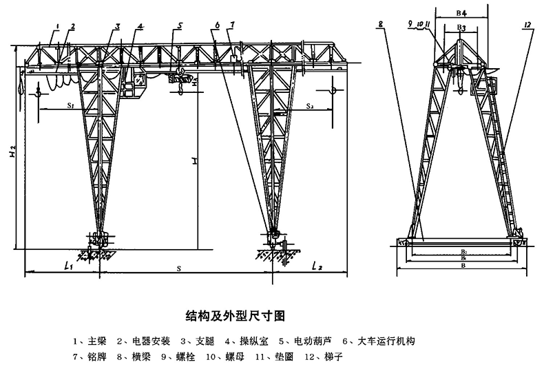 MH型電動葫蘆單主梁門式起重機結構圖紙: