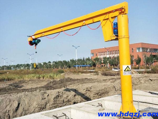 懸臂起重機的基本機構由柱子、旋轉臂旋轉驅動裝置和主機葫蘆組成。該柱的下端地腳螺栓固定在混凝土基礎上,懸臂轉動由擺線針輪減速器驅動。電動葫蘆在懸臂上左右直線運行,吊起重物。吊臂為空心鋼結構,重量輕,跨度大,重量大,經濟耐用。內行走機構采用專用工程塑料行走輪,并配有滾動軸承,摩擦力小,行走時結構尺寸輕,尤其有利于提升吊鉤行程。