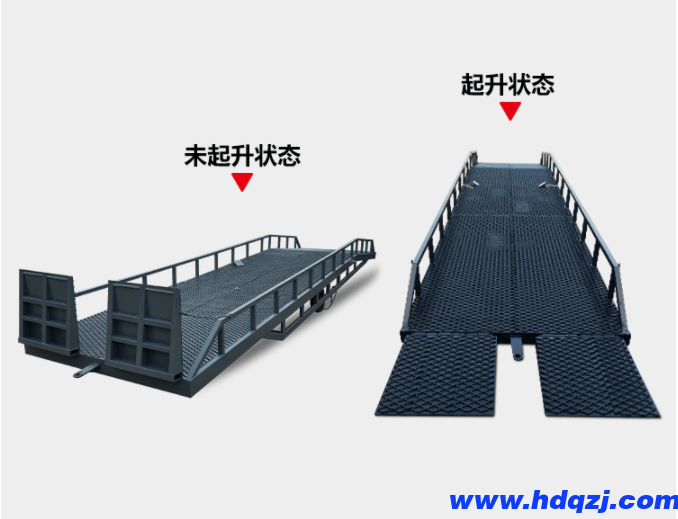 1.用液壓杠把移動式登車橋搖到所需要的位置高度,一般應高于貨車箱板